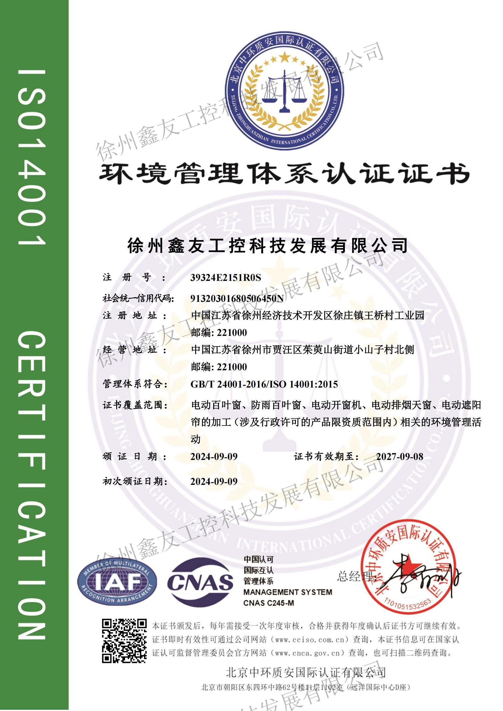 環(huán)境管理體系認(rèn)證證書